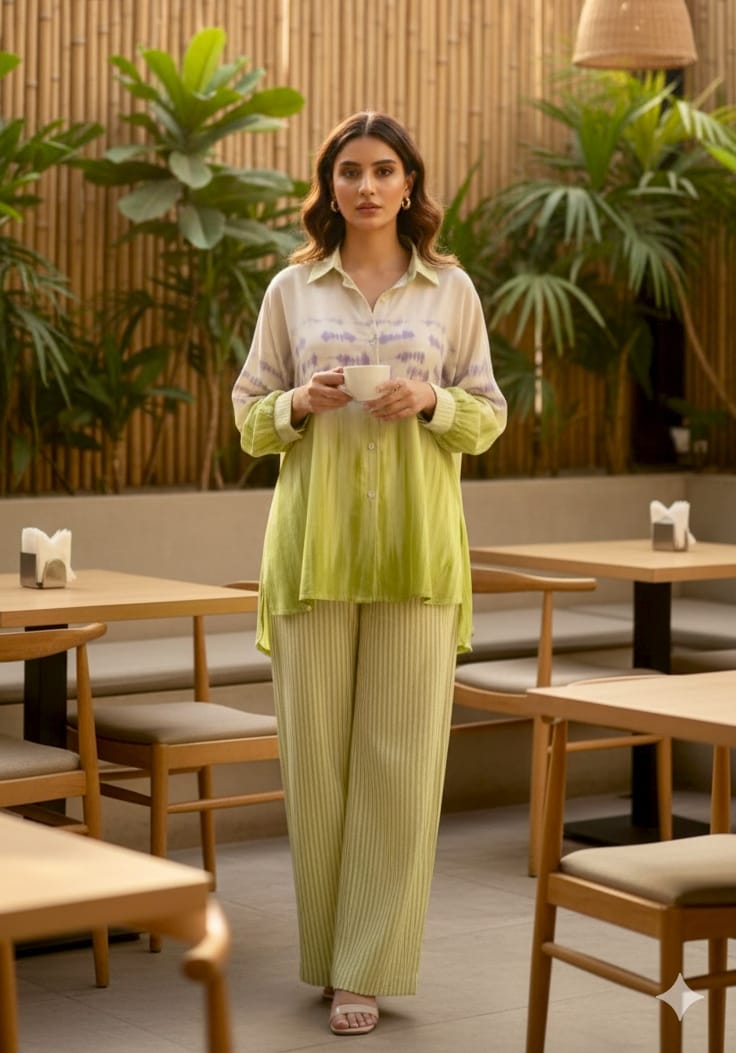A breezy co-ord set featuring a soft ombré kurta with delicate prints, paired with relaxed straight pants for an effortless, elegant look perfect for daytime outings or casual brunches.Fabric: Maslin Fabric material: Polyester