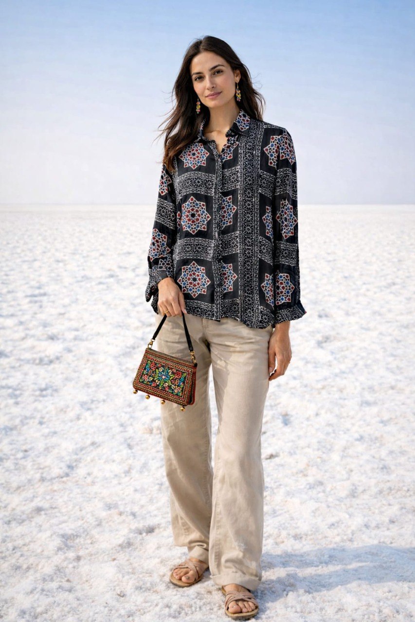 Kutch Noor Printed Shirt Code: LA141 Description: A timeless printed shirt inspired by Kutch artistry, featuring intricate geometric motifs and earthy tones perfect for effortless everyday elegance. Fabric: Modal satin
