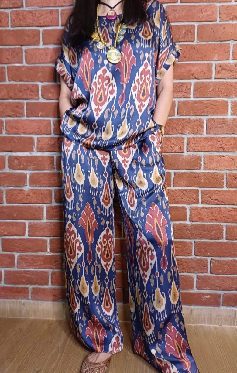 A relaxed co-ord set featuring an easy-fit top and wide-leg pants, designed for effortless comfort with a contemporary ethnic touch. Perfect for casual outings, travel, or relaxed evenings. Fabric: Modal maslin