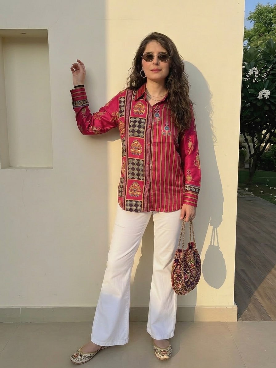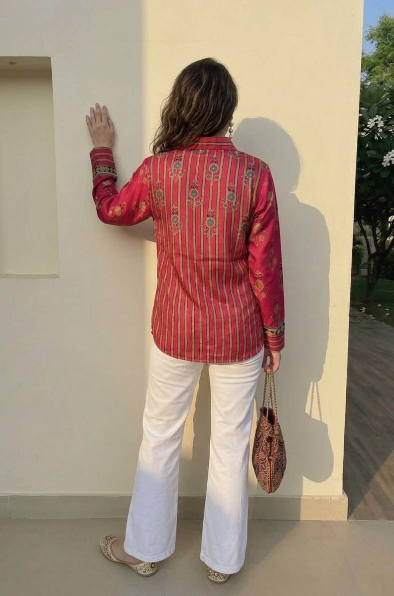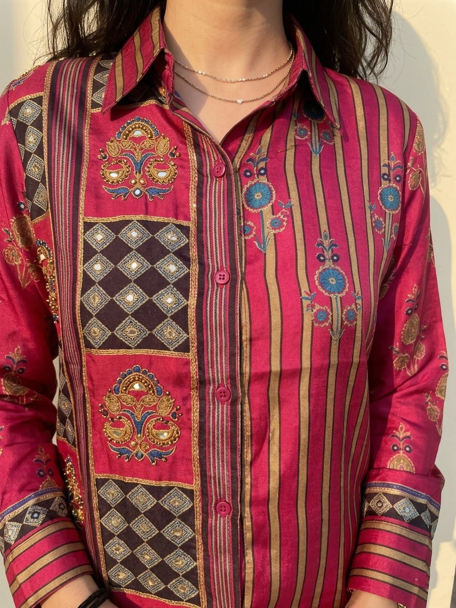 Vibrant Fusion Shirt A vibrant fusion shirt in rich red tones, featuring a striking mix of vertical stripes and traditional ethnic prints. Chic, versatile, and perfect for adding a pop of color to everyday casual wear. Fabric: Modal Silk