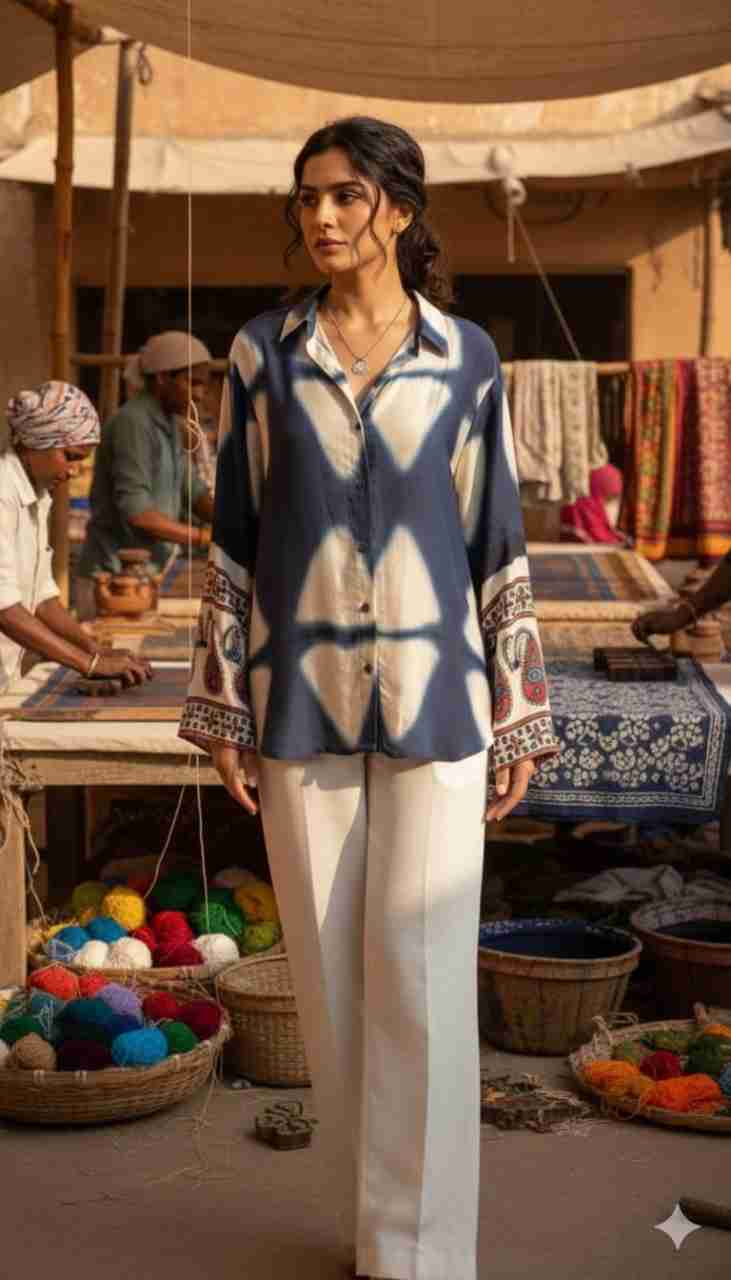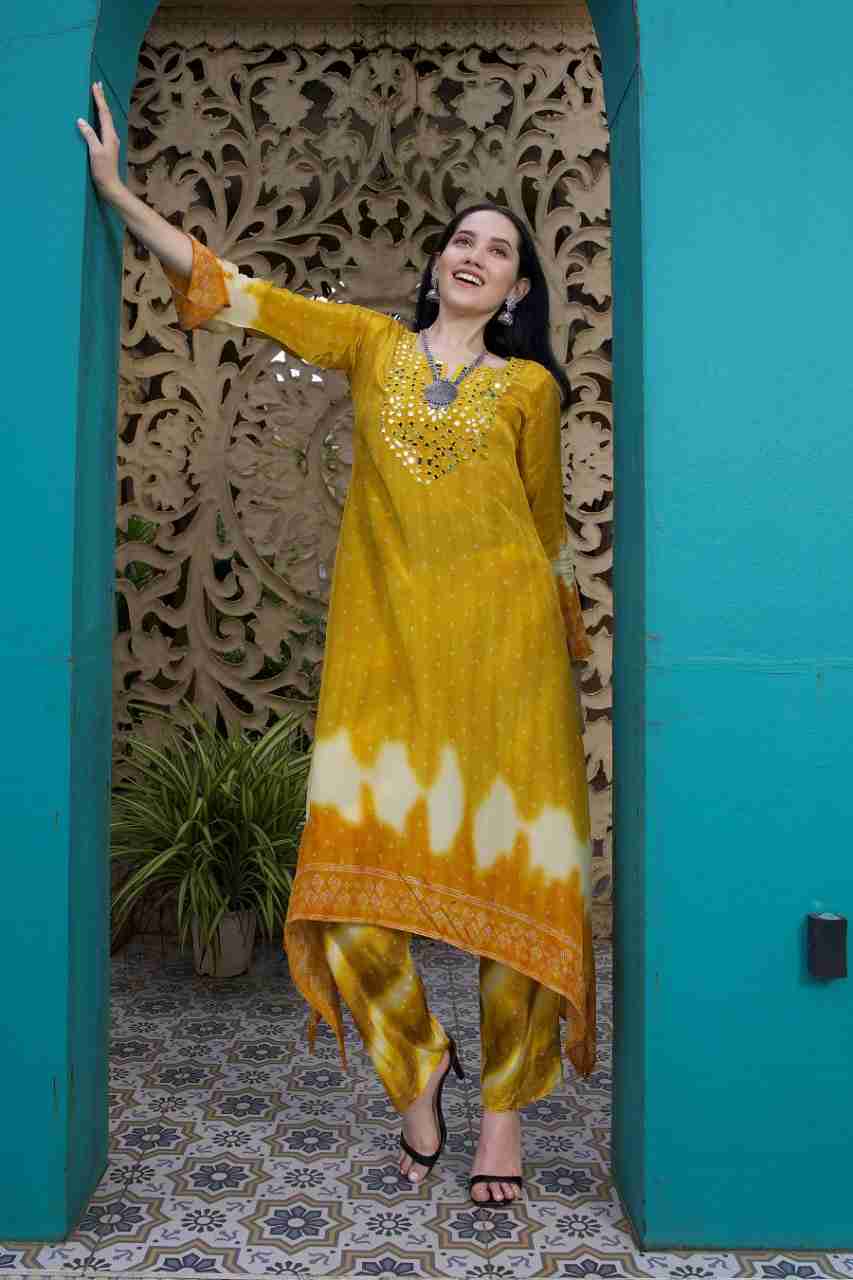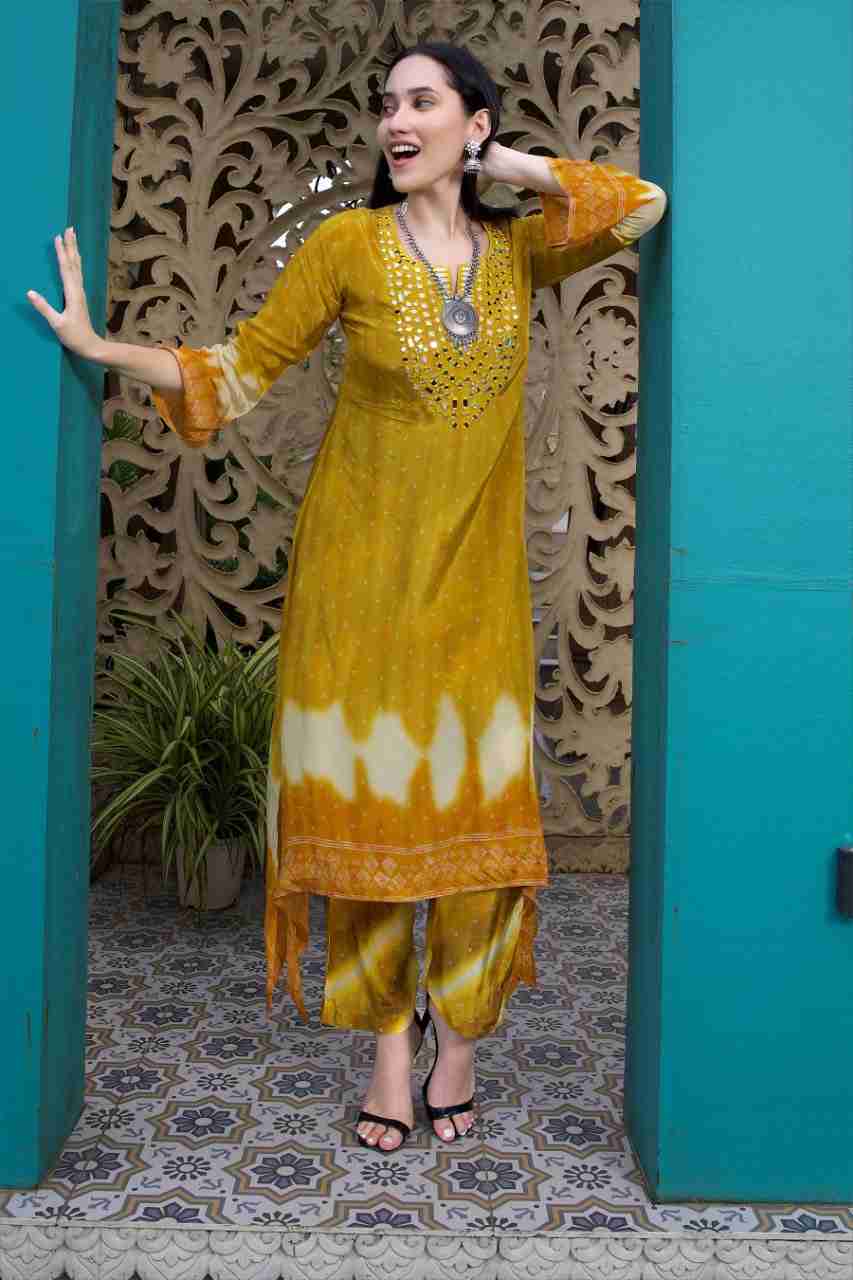 A Hand Tie Dyed Co-ord set on pure Chinon fabric in beautiful vibrant colors with high low shirt and balloon sleeves and flared pant