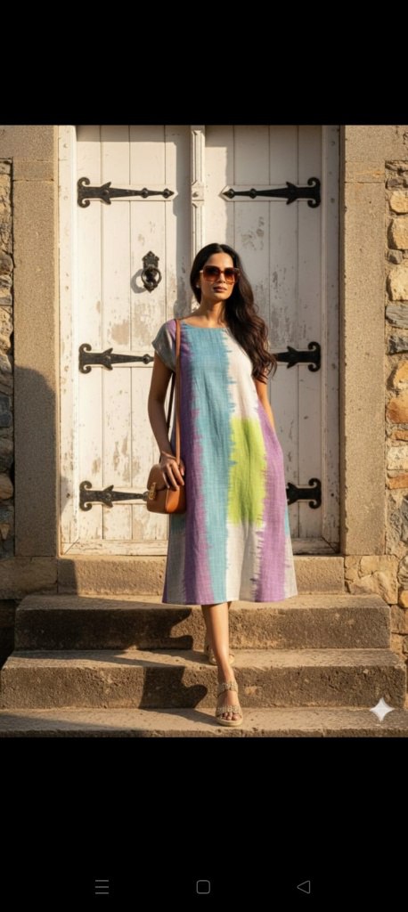 A chic midi dress featuring soft pastel vertical hues in blue, lavender, and lime, styled with sunglasses and a tan sling bag for an effortlessly elegant daytime look. Perfect for sunny strolls and casual outings.