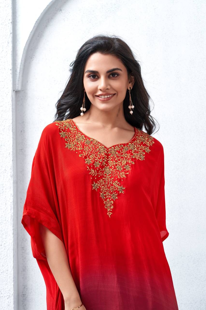 Experience the allure of our Shaded Red Maroon Kaftan Set, highlighted by a stunningly embroidered neckline. Designed for comfort and sophistication, this set is perfect for any occasion. Fabric- Natural crepe, Fully Stitched