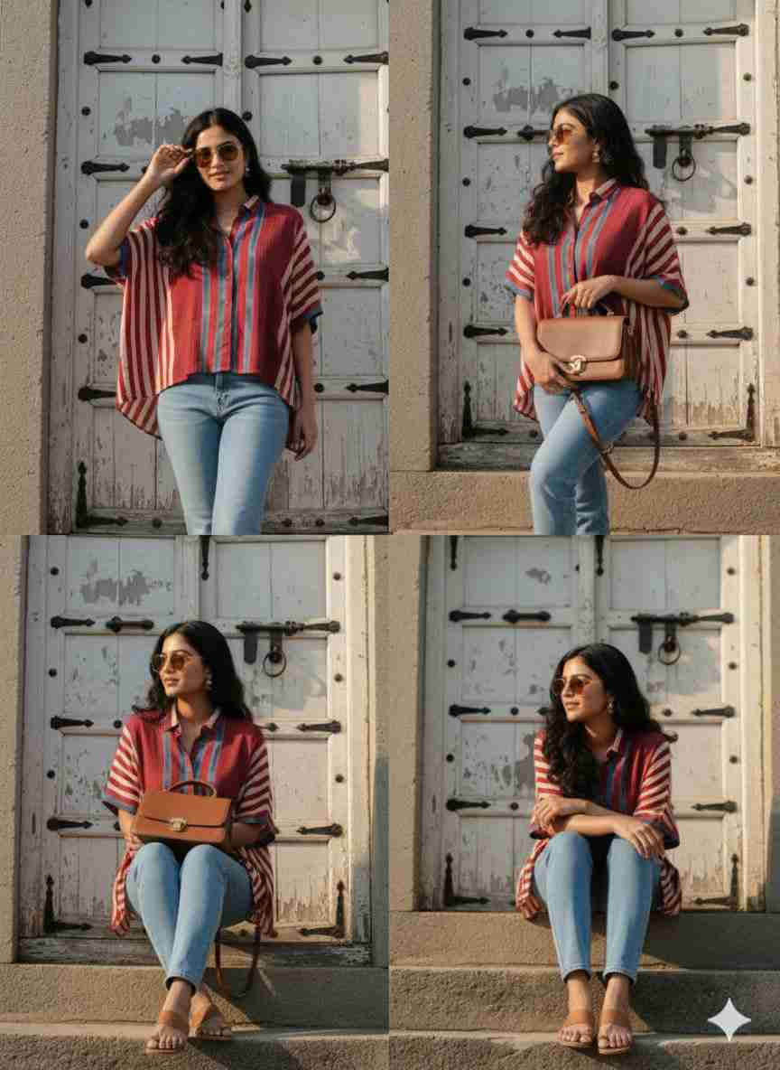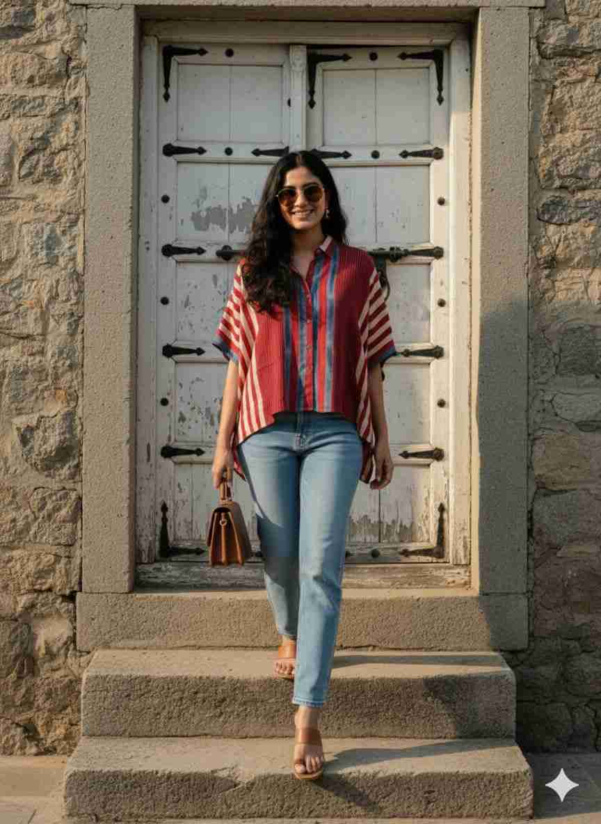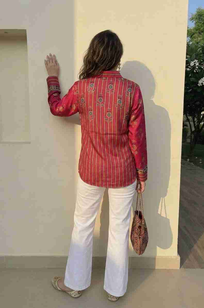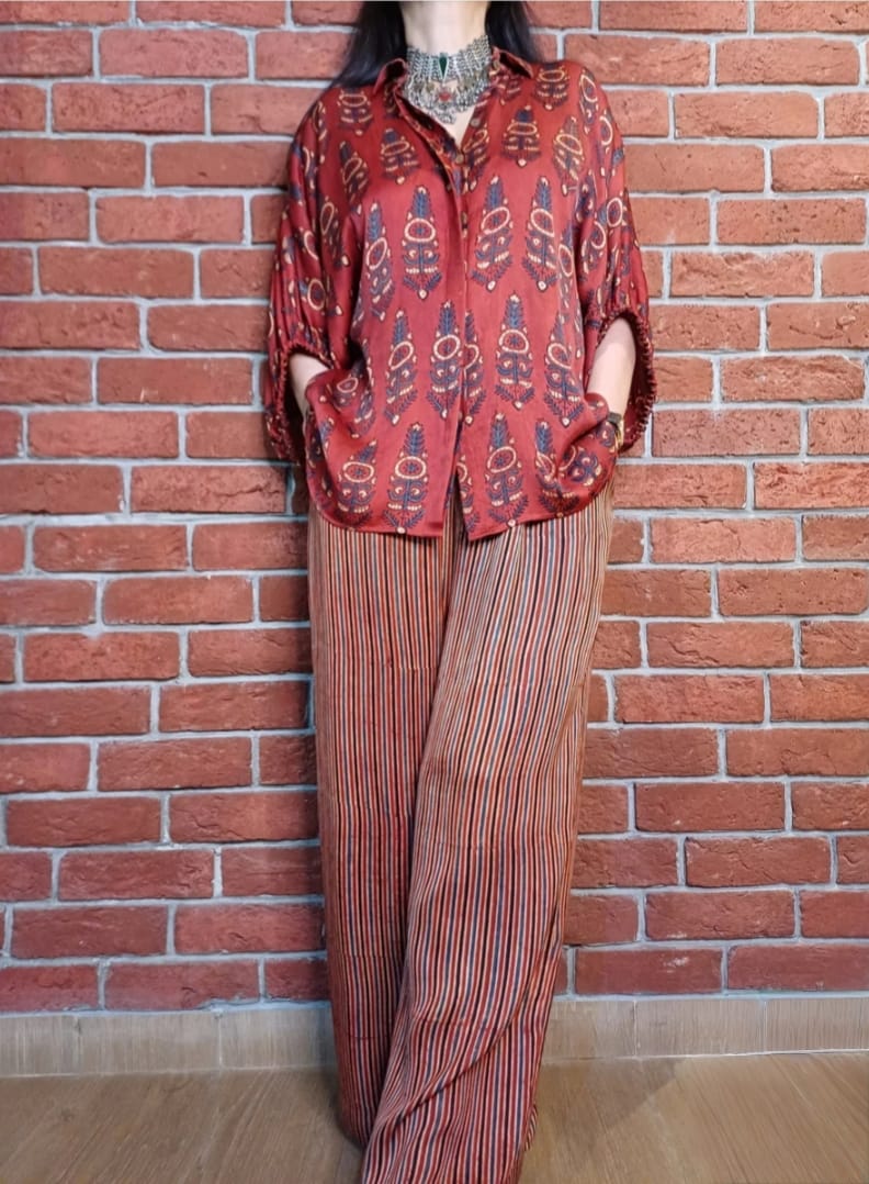 A relaxed boho co-ord set featuring a printed shirt-style top paired with striped pants. Designed for effortless comfort with an earthy, handcrafted vibe perfect for everyday wear or casual outings. Fabric: Modal maslin