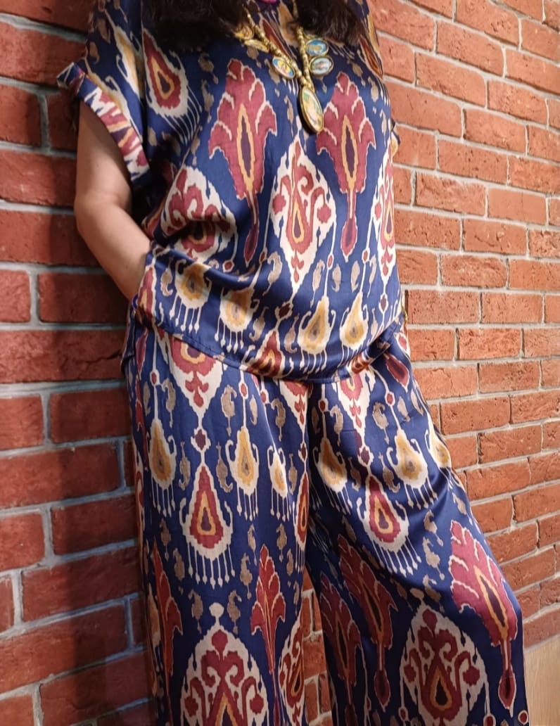 A relaxed co-ord set featuring an easy-fit top and wide-leg pants, designed for effortless comfort with a contemporary ethnic touch. Perfect for casual outings, travel, or relaxed evenings. Fabric: Modal maslin
