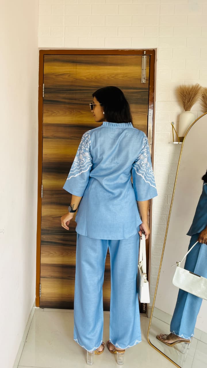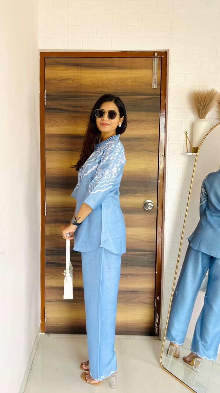 Description: A chic sky-blue co-ord set featuring straight kurta with a round frill neck with plackets and buttons and white floral print on the yoke and sleeves, paired with matching wide-leg pants.