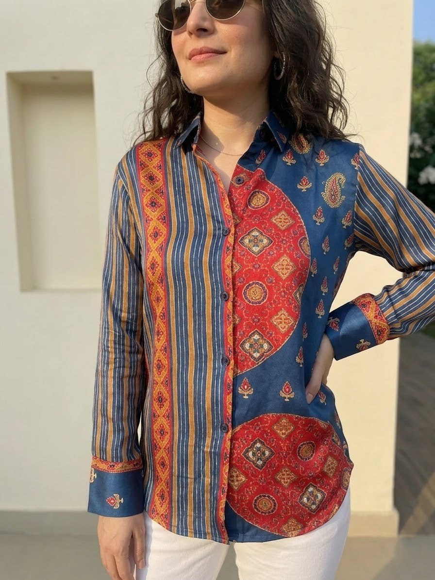 Stylish Satin Shirt A stylish blue shirt featuring vibrant ethnic prints and vertical stripes, perfect for a chic fusion look—easy to dress up or down. Fabric: Modal Muslin